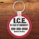 I.C.E. In Case of Emergency medical keyring tag lets medical personnel or emergency responders know who to call for your contact person and any other relevant medical information. Edit the bottom 2 lines with phone number and any other medical info. Carry this keyring with you at all times to alert people to your needs and wishes.