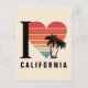Send a little sunshine from the Golden State with this stylish postcard featuring a bold I ❤️ California design on a warm antique white background. The eye-catching layout includes a large “I,” a retro-striped heart in sunset-inspired hues (red, orange, taupe, green, teal, and blue), breezy palm trees, and customizable text—perfect for showcasing your favourite California beach town like Santa Monica, Pismo Beach, San Francisco, or anywhere you call home.