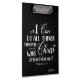 A black clipboard with a white "I can do all things through Christ who strengthens me" Philippians 4:13 bible verse. This is a clipboard that can be personalized on the front and backside with a name or other words > just delete that option if not using it.