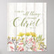Print with familiar scripture verse from Phillippians 4:13, "I can do all things through Christ" in a modern, typographic style with a light barnwood background and yellow and pink flowers along the bottom. Designed by Simply Scripture; floral art from Design Cuts.