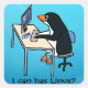 A penguin operating a computer, right after having lunch with the text "I can has Linux?". The text is customizable so you can add your own. Great for any Linux lover.