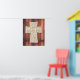 Poster with the Christian Bible verse I Corinthians 13:4-8 in the shape of a cross and sitting on a dark wood background. Love is patient, love is kind. It does not envy. It does not boast...