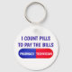 This keychain displays the text "I count pills to pay the bills." This humourous keychain is great for pharmacy technicians.