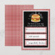 Fun, casual wedding RSVP card for the laid back barbecue wedding! Design features red and white gingham plaid trim. The centre of the invitation front is black with white trim. There is customizable text in a fun white, chalk like font where you can add your reply by date. Above the text is a yummy hamburger graphic with text in the same white font that says I Do's & BBQ! Below are three white rectangles with red gingham plaid trim. Inside the white boxes are text in black chalk like font and check boxes so your guests can write in their name and check their attendance. The reverse side of the RSVP card is covered in the red gingham plaid. Matching wedding invitations, stamps and paper plates also available.