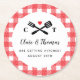The perfect finishing touch for an I Do BBQ engagement party or rehearsal dinner this drink coaster has the couple's monogram among grilling tools on a cheerful red picnic blanket pattern with easy to personalize text.