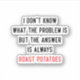 I Don't Know What the Problem is But The Answer is Always Roast Potatoes" design combines humour, minimalist typography, and a funny quote. Perfect for those who love witty sayings and timeless humour.