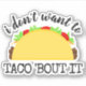 The I Don't Want To Taco 'Bout It Funny Sticker designed by Enchantfancy Design Company features a tasty looking taco along with the funny saying. This design makes a perfect gift for anyone who loves tacos and food puns.