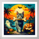 This design captures a playful Halloween adventure: a clever tabby cat proudly parades along a moonlit path, clutching a giant humerus bone in its mouth. The backdrop is a burst of retro sunset colours, casting palm tree shadows and filling the sky with lively bats. All around, glowing jack-o’-lanterns, a bubbling cauldron, a haunted house, and a friendly ghost set the scene for magical mischief. It’s a celebration of curiosity, mystery, and clever humour—where feline bravado and science pun meet in a festive, enchanting world that invites both laughter and wonder.