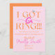 Celebrate the bride-to-be in style with this bold and playful "I Got a Ring" bachelorette invitation, featuring a vibrant pink and orange palette inspired by tropical sunsets and island vibes. Perfect for fun-loving bridal crews, this modern design blends flirty fonts, beachy tones, and customizable text to match your destination weekend, pool party, or final fling.