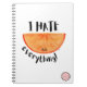 This sarcastic notebook has a kawaii orange fruit slice on it with "I Hate Everything" text. This cute orange design is hand painted with watercolors. The text can't be customized but you can change the background colour for anything you'd like.
