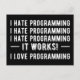 'I Hate Programming. It Works! I Love Programming' funny quote for programmers, tech enthusiasts, coders, and developers.