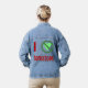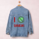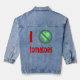 I hate tomatoes women's denim jacket. Humourous design uses red letters, a green heart and the international "NO" sign to read , "I hate tomatoes". For those that do not "heart" love apples.