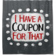 "I Have A Coupon For That" is a cute text design in grey with black and red text, along with a white accent shape and white textured whimsical dots surrounding it.