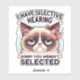 A playful and sarcastic design featuring a Himalayan cat with stunning blue eyes, brown and tan fur, and flowers adorning her ears. With a frown on her face, the cat is paired with bold black text that reads, "I have selective hearing. Sorry you weren't selected." This lively design is available on a range of products, making ideal gifts for cat lovers.
