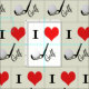 I heart golf - text design with a red heart , golf ball and club against beige background . Pattern design by Alma Wad .
