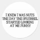 I knew I was nuts the day the squirrel started looking at me funny. Funny and silly saying on being crazy and squirrel. Play on words with nuts.