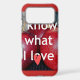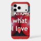 The text "I know what I love" is overlaid in bold, modern white typography, ensuring clarity and impact. A red location pin icon cleverly replaces the "o" in "love," adding a whimsical touch that symbolizes connection and passion. The background is slightly blurred, showcasing fabric and a dark surface that enhances the prominence of the apples and text.