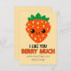 This adorable kids Valentine’s Day card features a large kawaii strawberry character paired with the sweet phrase “I Like You Berry Much” in playful, cheerful typography. Designed with bright colors and a fun, friendly style, this flat Valentine card is perfect for classroom exchanges, school parties, or passing out to friends. The charming strawberry illustration and whimsical lettering make it a delightful choice for kids who love cute, happy designs that feel extra special on Valentine’s Day.