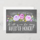 Propose to your maid of honour with a beautiful card that beautifully says "I literally can't even (without you). Will you be my maid of honour." This card features lovely watercolored flowers and a mix of modern typography, all on a trendy faux chalkboard background.
