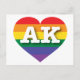 This postcard features a heart with a rainbow pride design and the letters AK. Atop the stripes, within the heart are the bold, white, capital letters AK, the official abbreviation for Alaska, the last frontier. Show your true colours, support marriage equality, and celebrate gay pride.