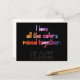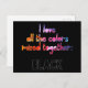 This plain black postcard features a watercolor rainbow caption that reads: "I love all the colour mixed together" and the word "BLACK" in all caps black font with a white outline.