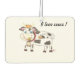 A custom car air freshener in the shape of a heart . It has the illustation of a white and black Swiss cow and the words "I love cows !" are written in black letters above it . Remember to choose your favourite smell :)  © ArianeC Illustrations