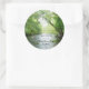 Photograph of a creek flowing through a forest with the words "I Love Forests, keep them clean & alive", displayed on a Sticker.
