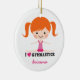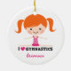 Cute personalized ornament for gymnasts featuring a little cartoon girl with red hair doing a side split. Below her is the text "I love (heart) gymnastics". Add a your name or other text. Fun design for girls.