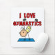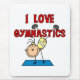 A stick figure girl does a handstand on the mat practicing her floor routine and text reads "I Love Gymnastics" on girl gymnast T-shirts, mugs, tote bags, mousepads, stickers, cards, and other girl gymnast apparel and gift items.