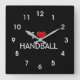 I Love Handball custom-designed wall clock. White lettering and red heart on black background.