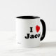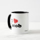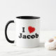 I love Jacob! Is your name Jacob? Do you have a wife, girlfriend, female family member or female friend who you know loves you? Or do you have a husband, boyfriend, male family member or male friend named Jacob whom you love deeply? If so, this "I Love" mug is exactly the gift that you're looking for! The design features the letter "I" in black lettering with a red heart on the top and "Jacob" in black lettering on the bottom.