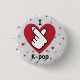 Use this adorable button to show off your love of K-pop. The button has a hand displaying a finger heart, and a cute, red heart background. You can change the text to the name of your favorite person, group, such as BTS, BlackPink, Seventeen, Stray Kids, Twice, ATEEZ, Somi, Monsta X, etc. This button would be great to wear to Kcon, or a K-pop concert.