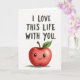 This sweet card combines cute graphics with fancy lettering to express love. At the top, the big words “I LOVE THIS LIFE WITH YOU” stand out in a textured, stylish script. Below, a friendly red apple with a green leaf and brown stem is painted with soft, colorful strokes. The white background makes both the words and apple pop, creating a cheerful, happy mood.