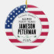 This patriotic US Military Photo round keepsake Christmas tree ceramic ornament features your hero's image, and "I Love My Airman, Guardian, Soldier, Marine, Sailor, Guardsman - with rank, name, and date printed inside a USA Flag frame on the back side ♥ Designed by a proud Air Force Mom ♥ Perfect gift for Air Force, Space Force, Army, Navy, Marines & Coast Guard Moms / Dads / Spouses / Grandparents / Family / or for yourself, to keep your loved one close by this this Holiday season! Easily upload your photo on the front - current photo is for place holder use only, it is a must to upload your own. Wording colour may be changed to white to stand out over your photo, and option to add your service member's rank / name - simply click the blue "Edit Using Design Tool" button, and make it your own! Custom design requests, colours, or template questions are always welcome - click the "message button", or email: contact@figandlilyco.com. Sending merry blessings this Christmas and all year long ♥