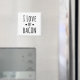 Funny black and white refrigerator magnet. Hand drawn font. I love my bacon. Works for a steel grill as well.