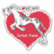 Let every one know that you LOVE your Great Dane (harlequin with cropped ears) with this big red heart & leaping dane with the text "I Love My Great Dane" From Danes-R-Us.