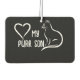 This fun car air freshener features a white heart, white cat silhouette and white text that reads: (heart) love my purr son. This air freshener makes the