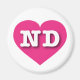 This product features a vibrant hot pink heart containing the bold, white, upper case letters ND, the official abbreviation for the state of North Dakota.