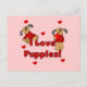 Two cute brown dogs dressed in red sweaters, red hearts, and red text that reads "I Love Puppies!" is featured on puppy dog t-shirts, mugs, tote bags, stickers, keychains, and more.