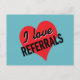 I love referrals design with a red heart on an aqua background is great for realtors or any service business to remind your customers to recommend you. Send to your happy clients after a job or service is complete, or just to your friends and associates as a direct marketing reminder.