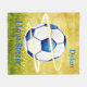 Yellow bohek lights with green grass and a blue and white soccer ball.