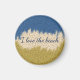 A very simple round blue and brown magnet . It is an bastrect desing and it says " I love the beach" . It was inspired by the sandy beaches in San Diego . Feel free to change the text if you would like to .:)