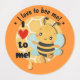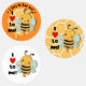I love to bee me! round sticker. A Cute bumblebee together with text forming «I love to bee me!». Honeycomb in the background with dripping honey. The honeydrop and the bumblebee have a shadow to Create a 3D effect on top of the background. This positive, motivational and happy sticker are usable in many situations; this Size and style are perfect on displays and packaging. Maybe a product with honey. 3 different design, sheet of 15 in total, one design with Customizable text.
