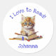 This cute little kitten says, I Love to Read! Here's an adorable watercolor tabby kitten, adorned with a flower crown of tiny blue flowers and one red ladybug, and doing her very favourite thing: Reading a book! The light blue text matches her blue ribbon bookmarker. All together, it's a soft, lovable image of a child's pure love of reading. Here it is on some stickers.