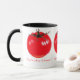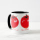 This Mug features an original design with three bright red tomatoes in a row at the top, and the sentence "I love tomato soup!" under the photos, in three languages: French, English and Spanish. The tomato in the photo looks "electrified", with the green stem and leaves made of zigzag lines, and a zigzag line white highlight on the shiny tomato red skin. These tomatoes are red hot, and this mug is great for tomato soup.