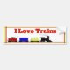 Colourful bumper sticker for all you train lovers, with a colourful cartoon train complete with engine and red caboose and I love Trains in bold red text.