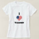 This cute and patriotic women's Donald Trump t-shirt features the simple slogan "I Love Trump" with the word "Love" replaced with an American flag pattern heart. The bold black font is lovable. It's a simple statement but it gets your point across!
