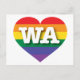 This postcard features a rainbow pride heart overlaid by the bold, white, capital letters WA, the official abbreviation for Washington, the evergreen state. The reverse side of the postcard is blank, awaiting your personalized sentiments or customized text. Show your true colours, support marriage equality, and celebrate gay pride.