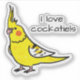 A cute cartoon drawing of a yellow cockatiel parrot. It's shown here on a custom die-cut sticker. You can move the pet bird around anywhere on the sticker and change the "I Love Cockatiels" to any text you prefer. Select from more sticker sizes. This sticker make a fun little gift for any cockatiel lover!