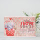 An adorable elephant on a yummy cupcake. Features the words "I love you more than cupcakes". Back says Happy Valentine's Day over a light pink background. Back text can be edited to be a personal message to a special person!